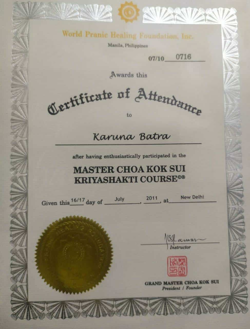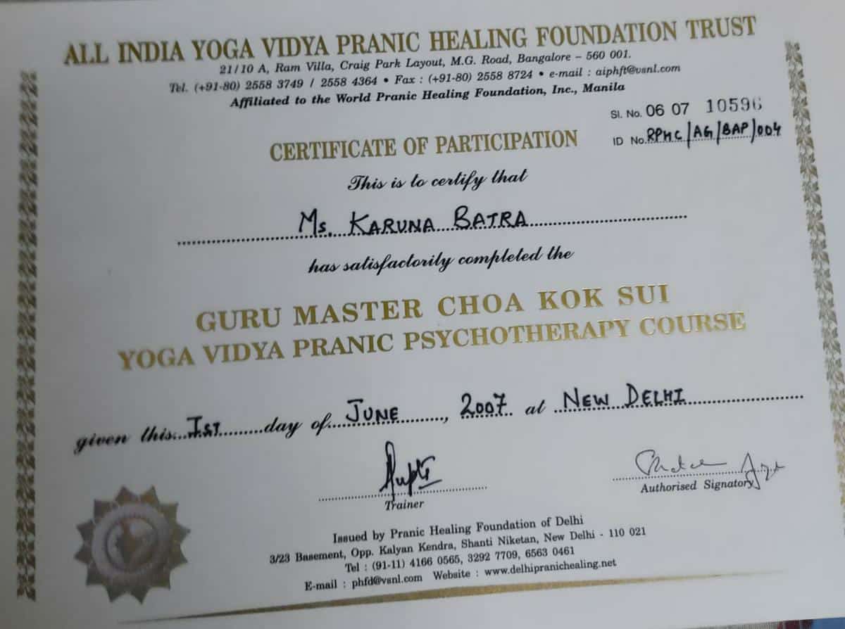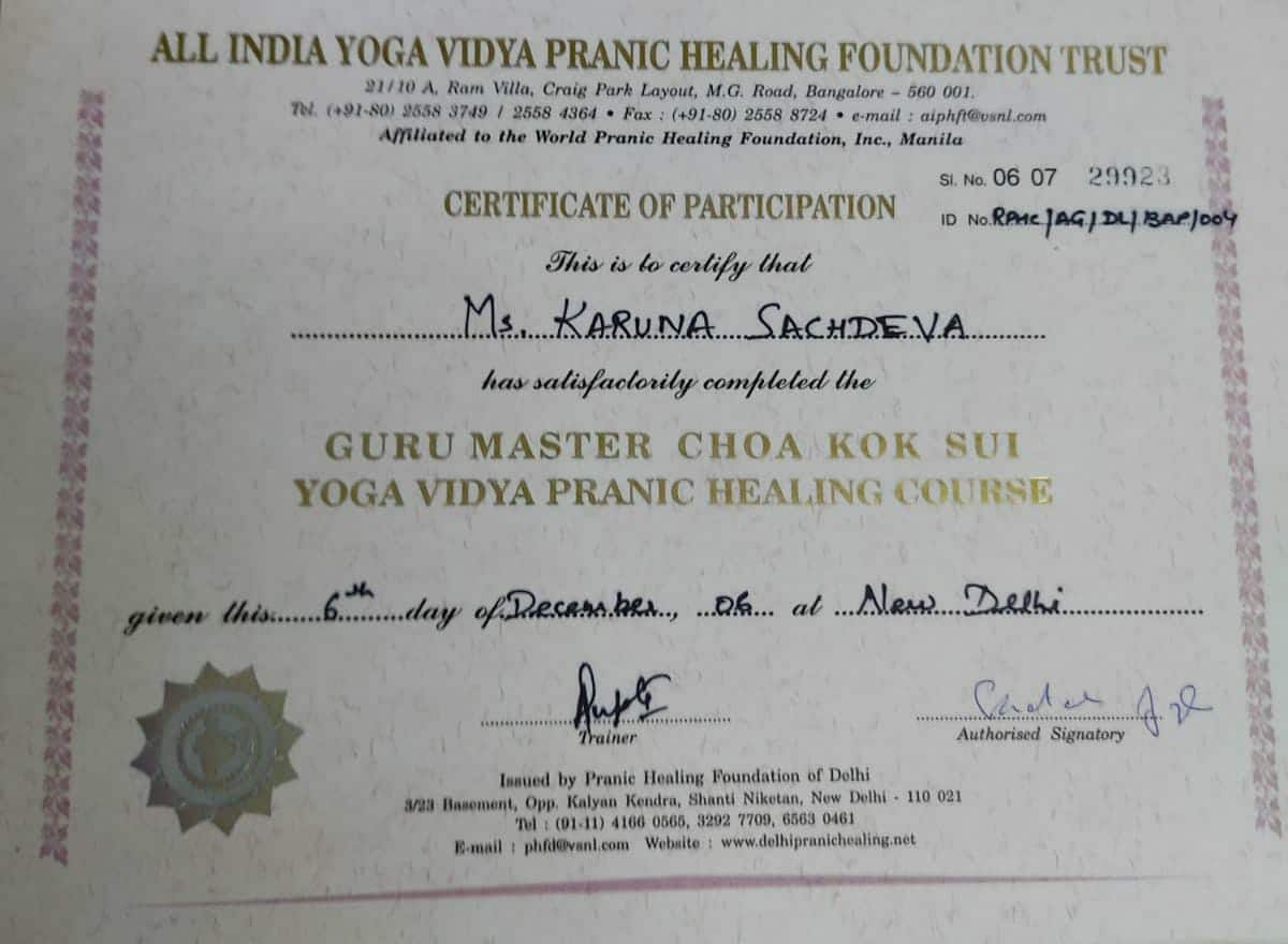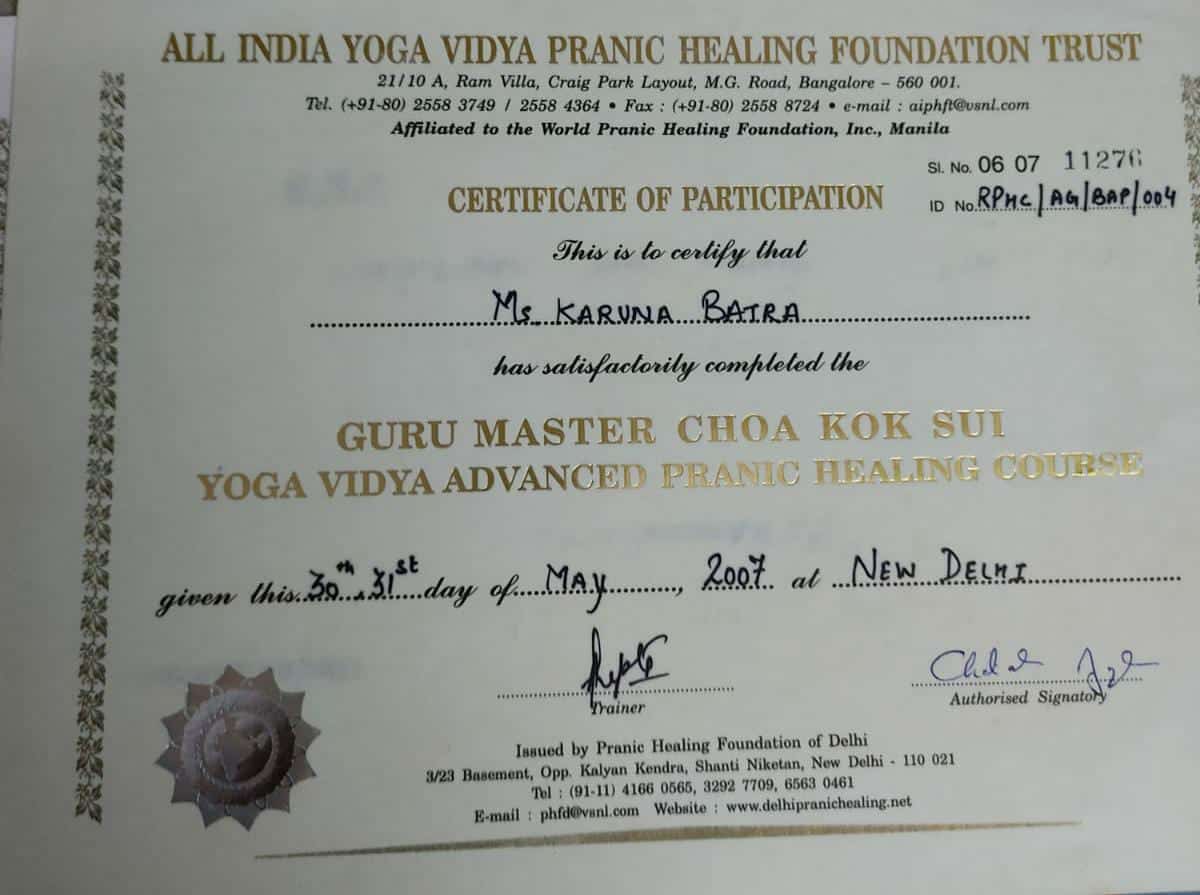 Karuna Batra is a Pranic healer in Rohini, Delhi. She started her journey as a Pranic healer in 2006. She has worked with one of the senior Pranic healers for 5 yrs at her center located in Sector-7, Rohini. She has completed doing basic Pranic Healing, Advanced Pranic healing course, Pranic Psychotherapy, Crystal Pranic healing courses.